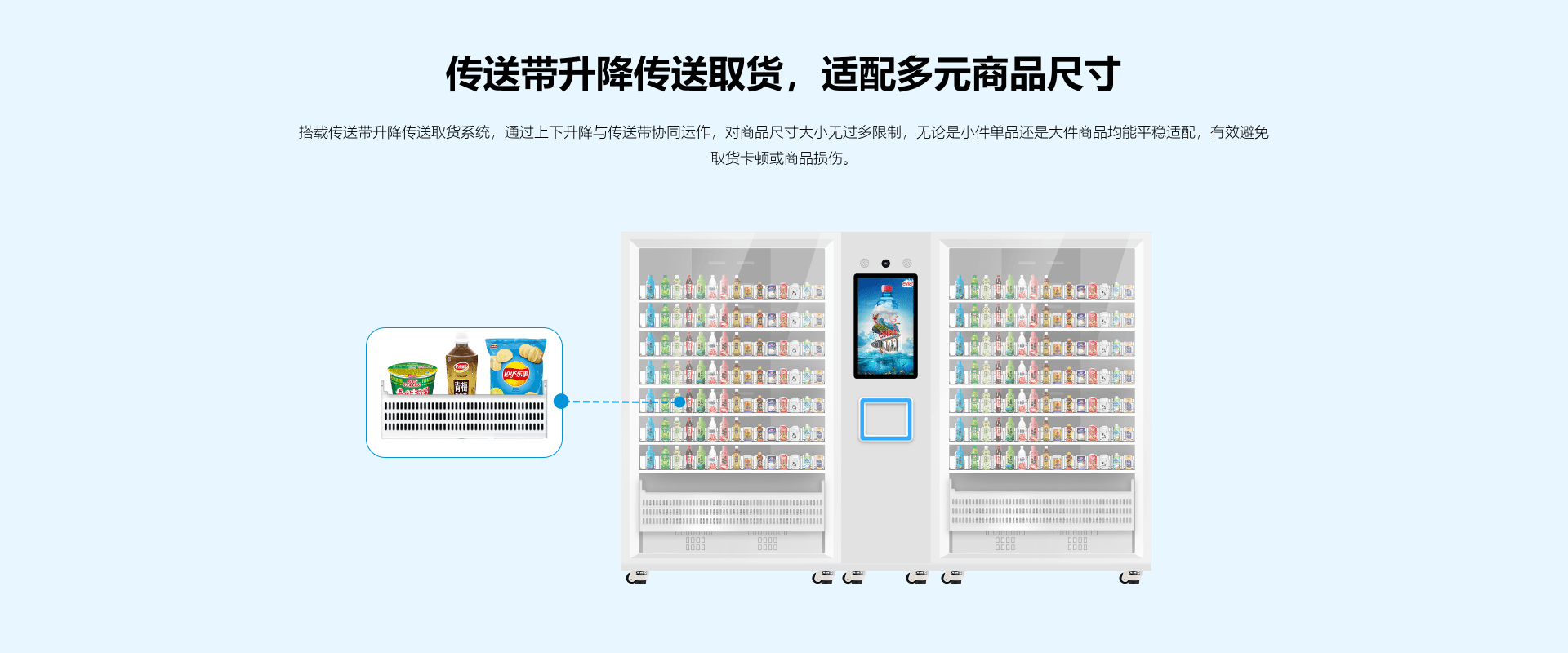 微电脑控制终端, 单边最大可支持80个货道, 支持声光调控, 支持多路多型号反馈传感器控制, 支持升降系统自动寻址定位功能